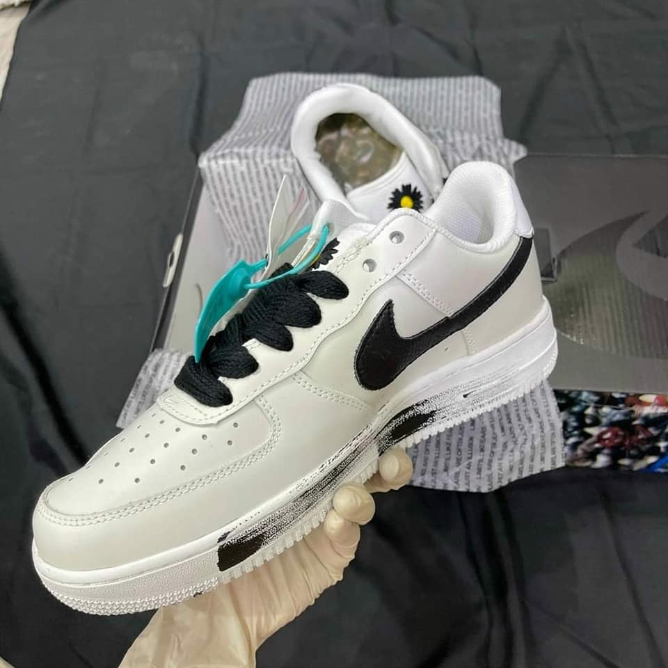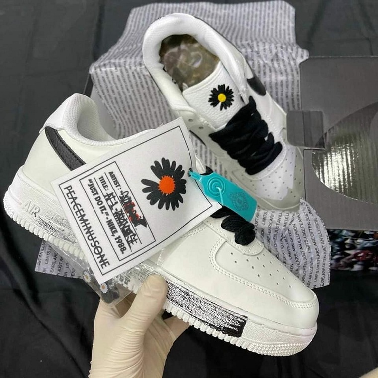 Bên cạnh đó, tương tự như phiên bản Nike Air Force 1 đầu tiên, chiếc giày này có một lớp có thể tháo rời ở phần trên bằng da trắng để lộ tác phẩm nghệ thuật cá nhân của G-Dragon bên dưới. Hoa cúc đen trên lưỡi, với Swoosh và dây giày màu đen.