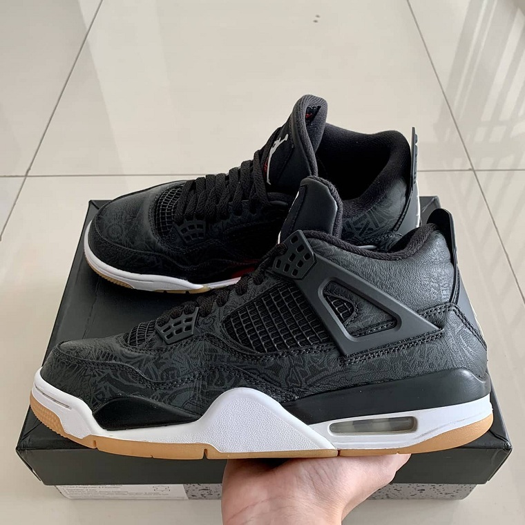 Là sản phẩm mừng sinh nhật 30 tuổi của AJ4, dĩ nhiên phối màu này sẽ được chăm chút sao cho ấn tượng nhất. Đập vào mắt đầu tiên sẽ là phần upper bằng da đen bóng chủ đạo, đồng bộ với dây giày và lót trong, được khắc các họa tiết đại diện cho những mẫu Air Jordan 1 đến Air Jordan 18 được in nổi lên upper, dù không nổi bật nhưng lại vô cùng sang trọng. Tưởng phản với tông màu đen là midsole màu trắng với cửa sổ air và mặt đế gum không kém phần thời trang. Dĩ nhiên không thể bỏ qua logo Jumpman ở sau gót và trên logo ở lưỡi gà. So với những phiên bản Air Jordan 4 “Laser” trong lịch sử, đây được xem là phối màu đẹp nhất, ngang ngửa với mẫu “White Laser” ra mắt năm 2015″.